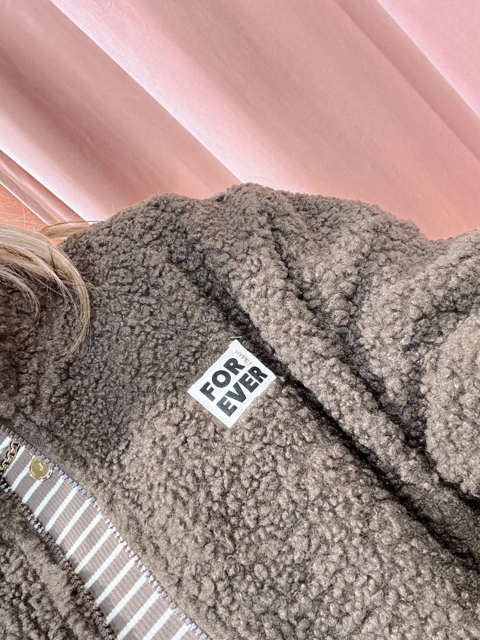 De Floris Cardigan in bruin is een oversized teddy vest met een hoge kraag. Het vest is gemaakt van een warme, zachte stof en heeft een suède-look binnenkant. De Floris Cardigan is voorzien van een "forever HYPE!" patch links op de borst, een ritssluiting en twee steekzakken.
